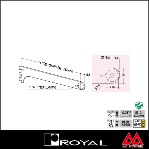 商品名 ロイヤル ステンレスハンガーブラケット(外々用) SUS-A-79 300 ステンレスヘアライン 品番 ROYAL-SUS-A-79-300 サイズ 呼び名 300 (※パイプ芯寸法:呼び名-9.5mm) 対応パイプ Hバーステンレス25φ(SUS-HB-25)用 厚み t=3.0mm 角度 0.75°UP 加工対応(別売) PLパイプ振れ止め(付属品)のかしめ加工対応可能 (※追加加工となりますので、PL用加工商品を一緒にご購入ください。